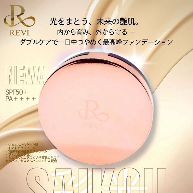 ルヴィファンデーションからついに新作が誕生いたしました! 水光を超える彩光【最高】ファンデーション 「彩光ファンデーション」は肌を育てる肌育ファンデの考え方を前提として“もっと輝きを増す肌を作り出したい、REVIとして輝く肌を演出したい。”という思いから誕生した【エクソソームファンデーション】です。 また、スピキュールが苦手な方にも愛用していただけるファンデーションを作りたいという思いから、スピキュールなしのファンデーションとして開発いたしました。 リフトアップには陶肌ファンデーション、光で彩った最高のツヤ肌を生み出すには彩光ファンデーションという形でお使いください。 単に肌をカバーするファンデーションの機能を超え、持続的に使用すると肌内側からケアして肌全体に光をもたらす最高のファンデーションの誕生です! 【彩光ファンデーション】 肌育ファンデとしてはもちろん、より輝きを増す肌を作り出し、最高峰の輝きを演出したいという思いの基に誕生しました。 スピキュールファンデが苦手な方にも愛用いただける針なしのファンデーションとなっています。 商品特徴 ■アウトケア ・SPF50+/PA++++の強力な紫外線遮断能力でお肌を保護。 ・ダイヤモンドパウダーと9種類のジュエルパウダーの組み合わせのソフトフォーカシング効果により肌を華やかに演出。 ・肌表面ではフィルムエクセルの皮膚膜形成効果でケア。 ■インナーケア ・トマト、乳酸桿菌発酵液の2種類のエクソソームを配合。(抗酸化作用・ハリ感の向上・美白効果・肌の再生・バリア機能の改善が期待できる) ・カエサルピニアスピノサ果実エキス、カッパフィカスアルバレジエキスをフィルムエクセル化し配合。(肌のキメを整える・小じわを目立たなくする・リフトアップ効果・保湿効果を高める) ・REVI製品ではお馴染みのリンゴ幹細胞エキス、アルガン幹細胞エキス、ブドウ幹細胞エキスを配合。(肌の老化防止、再生・目尻のシワの深さやほうれい線の深さの改善をサポートする) ・ヒト臍帯血幹細胞を配合。(肌にハリ・潤い・ツヤ・キメを与え、生まれたての赤ちゃんのような肌へ導く) 単に肌をカバーするファンデーションの機能を超え、持続的に使用すると肌内側からケアして肌全体に光をもたらす最高のファンデーションの誕生です! 主要成分 ・トマトエクソソーム →活性酸素抑制、抗酸化作用、消炎、収れん作用 特徴であるメラニン含有量を減少させる作用は、美白効果にも期待できます。 ・乳酸桿菌(にゅうさんかんきん)発酵液 →乳酸菌から分離したエクソソーム。韓国済州(チェジュ)島の清らかな水で漬けたトンチミ(韓国の伝統的な水キムチ)から特許取得済みの菌株を使用。 バリア機能改善、治癒作用、免疫調節機能、抗炎症作用、抗アレルギー、美肌、皮膚バリア増強、アクネ菌やアトピーにも非常に効果が高いです。 ・FILMEXEL® カエサルピニアスピノサ果実エキス、カッパフィカスアルバレジエキスが第二のセカンドスキンとして、空気中の目に見えない汚れから肌を保護します。 キメを整え、小じわを消し、アミノ酸、ミネラル、ビタミン、のアンチエイジング効果の高い成分をお肌に届けます。 ・9種類のジュエルパウダーを配合 ダイアモンド、ルビー、サファイア、パール、アメジスト、琥珀、サンゴ、ネフライト、トルマリンのパウダーが配合されており、水光肌を超えるこれまでにない輝き、ツヤを演出します。